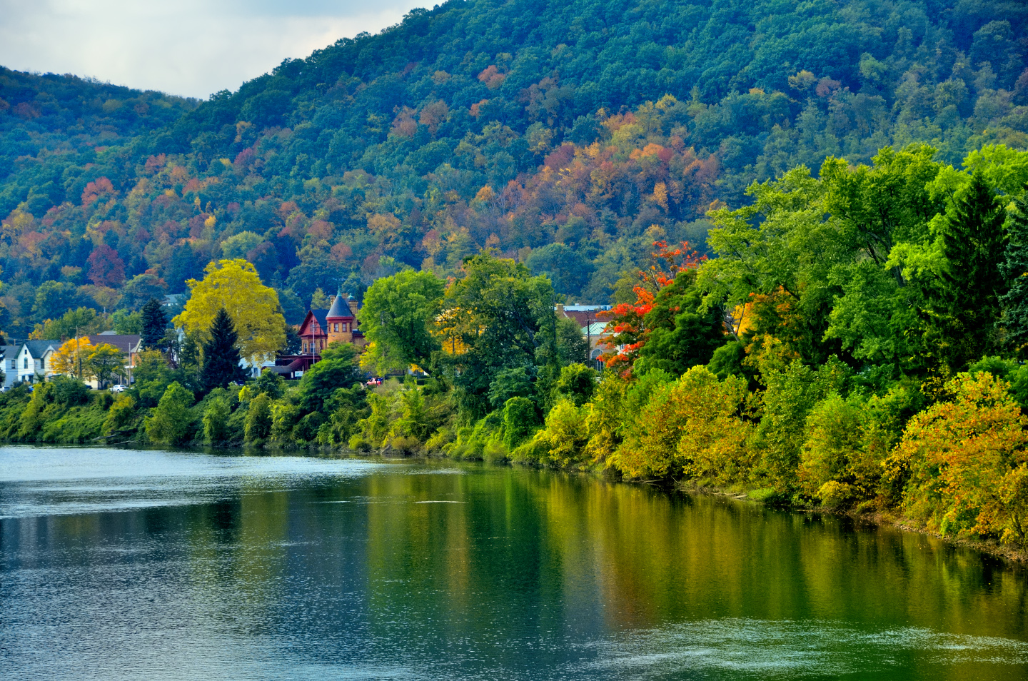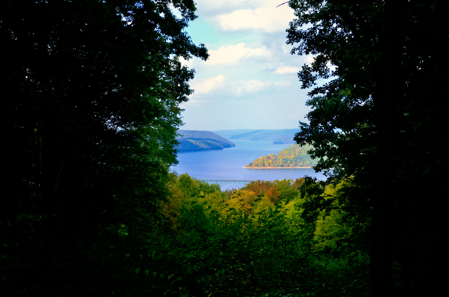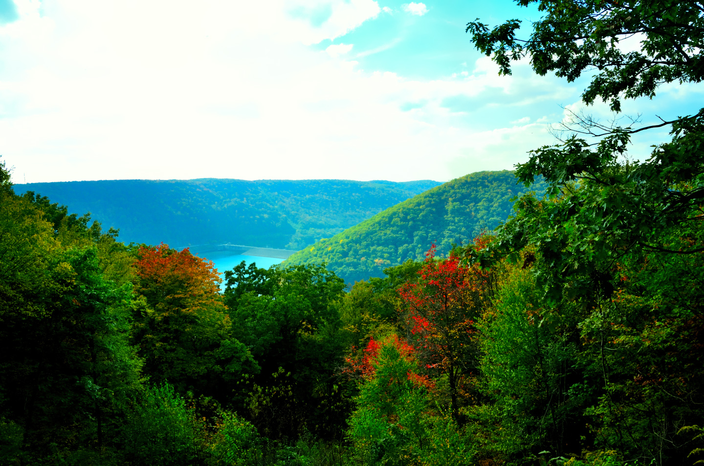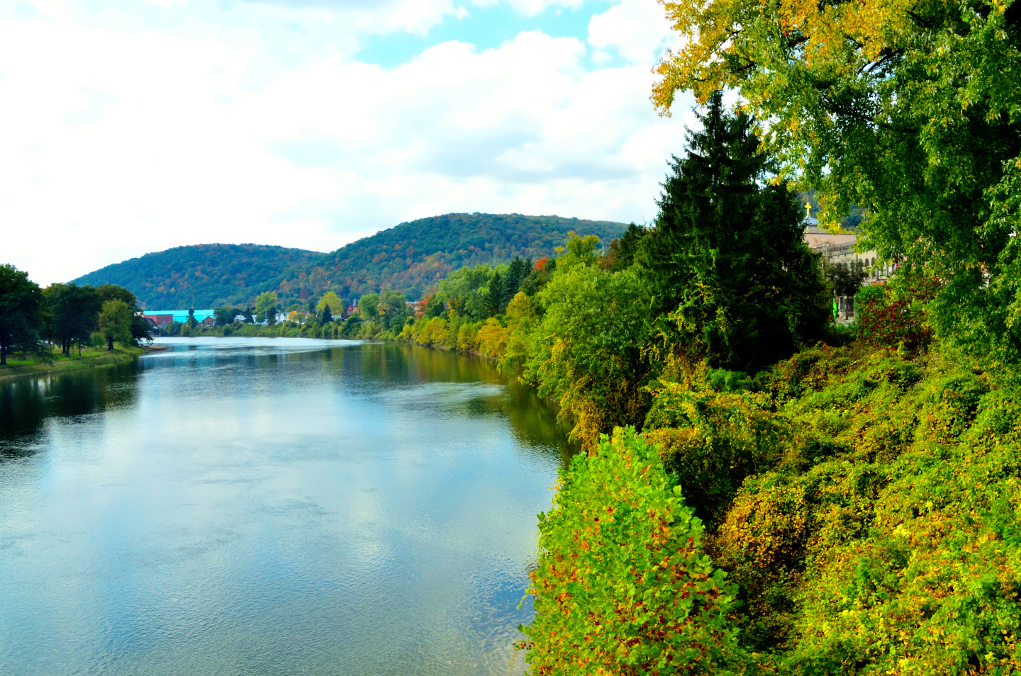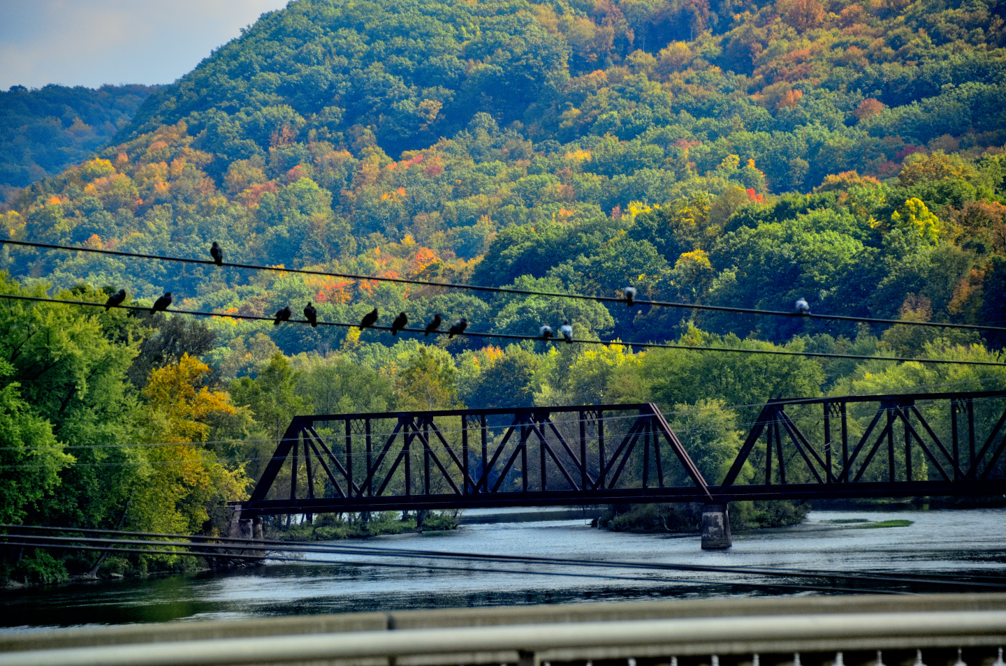 The Allegheny Mountains are a major subrange of the Appalachians, running from northern Pennsylvania into West Virginia. In Pennsylvania, there is also an Allegheny County, an Allegheny National Forest, an Allegheny River, and a massive, quite beautiful Allegheny Reservoir. The Reservoir was our destination that day, and to get to it, we travelled through the mountains and the forest, following the Allegheny River part of the way. After leaving Waterford, we took Route 92 to Union City, where we picked up US 6, which took us to Warren, home of the Blair mail order catalog company. (Which was quite a big deal, until Amazon came along and stomped the life out of the competition.) The Allegheny River was seriously picturesque as it flowed through the town, the foliage in the surrounding hills ablaze with the hues of Autumn.