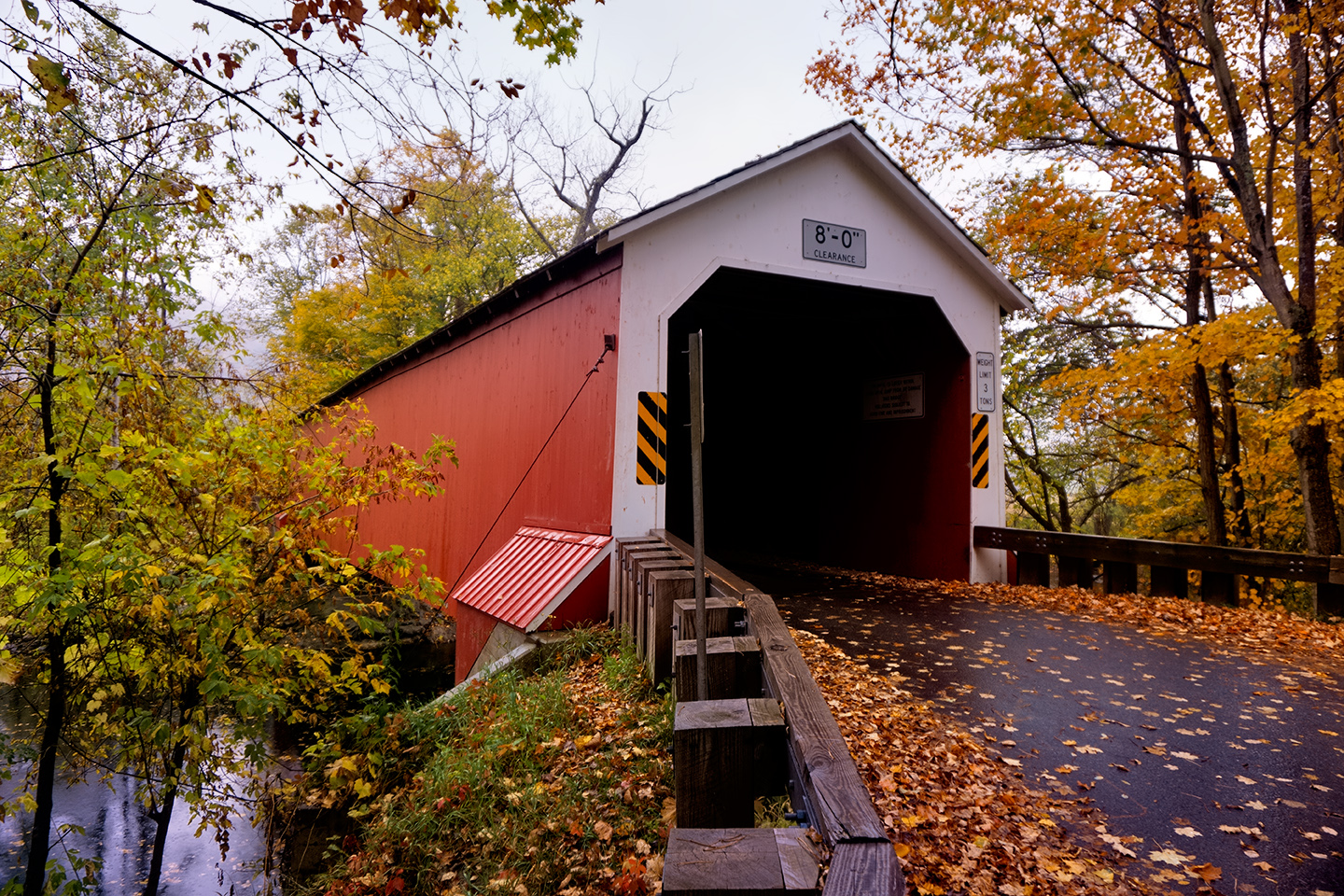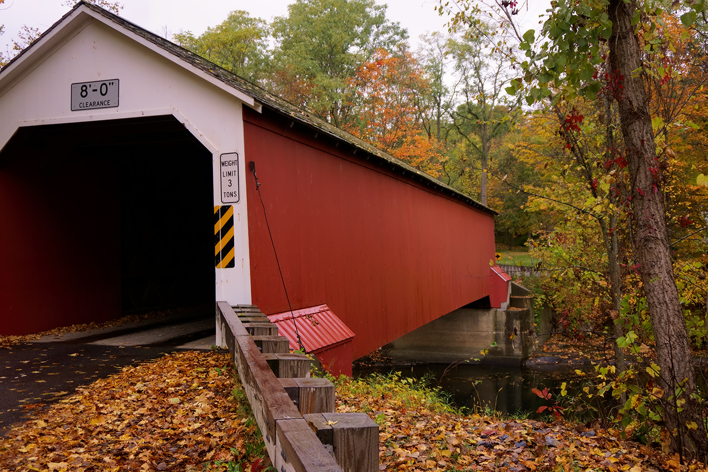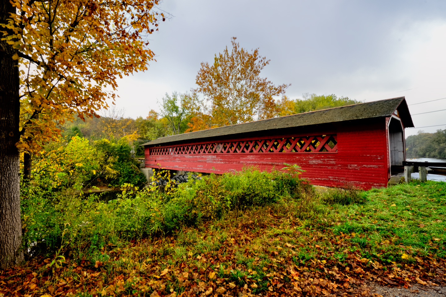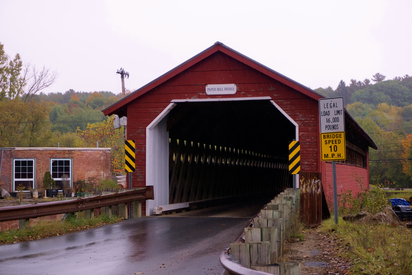 The Paper Mill Bridge is the youngest of the three bridges, built in 1889, and named for the pulp mill and paper factory that operated on the banks of the river in the late 1800’s. This is the longest of all the covered bridges in the area: the main span measures 125 feet, and the structure as a whole is a quite respectable 163 feet in length.