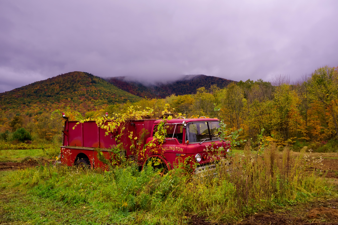We saw something unusual in a field just off the road. I used my telephoto lens to get a closer look, and was pleasantly surprised by this overgrown abandoned fire engine.