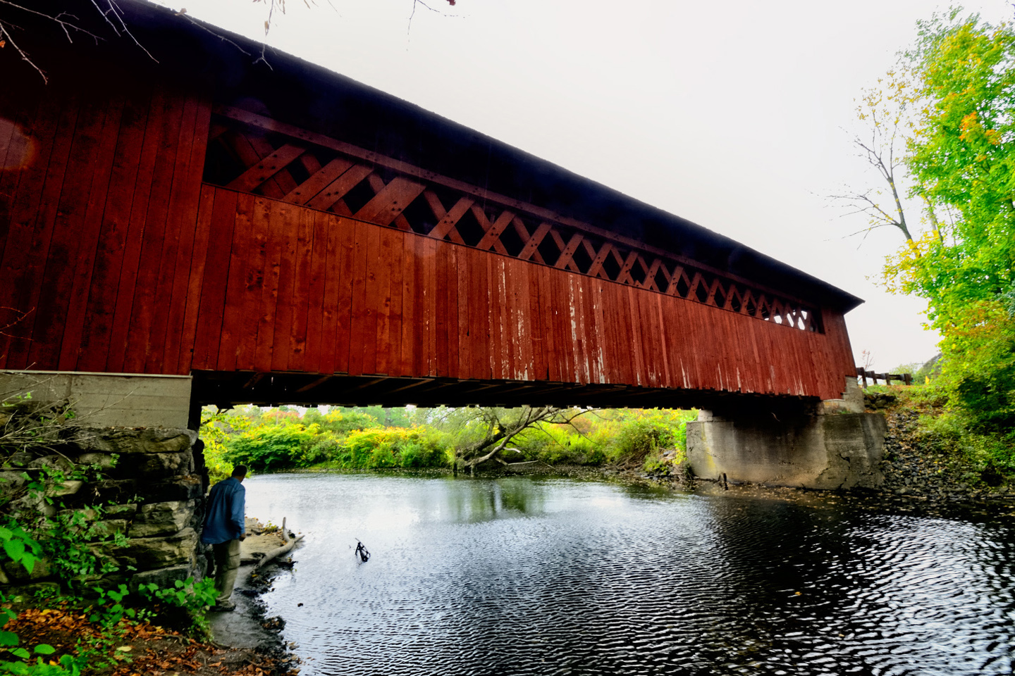 All three of Bennington’s covered bridges can be found within two miles of one another, and the fact that they were built so close together shows how important these bridges were to early residents of the town. Flowing water in the river was a cheap source of power, so multiple industries and communities developed along the riverbanks, necessitating multiple river crossings to connect different parts of Bennington for commerce, transportation, and daily travel. Which brings us to the second covered bridge on our tour:
