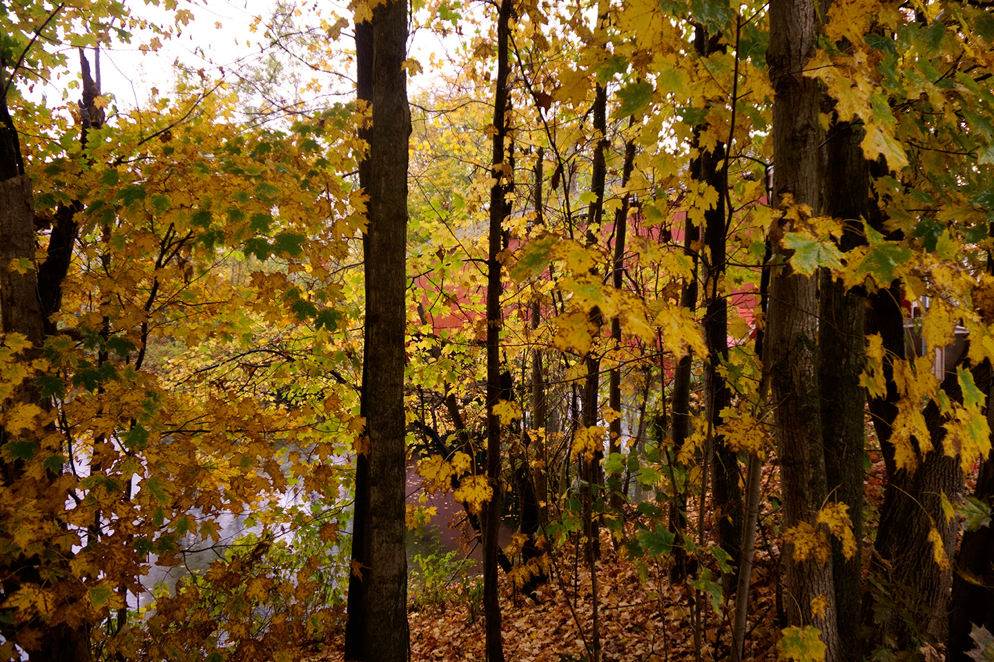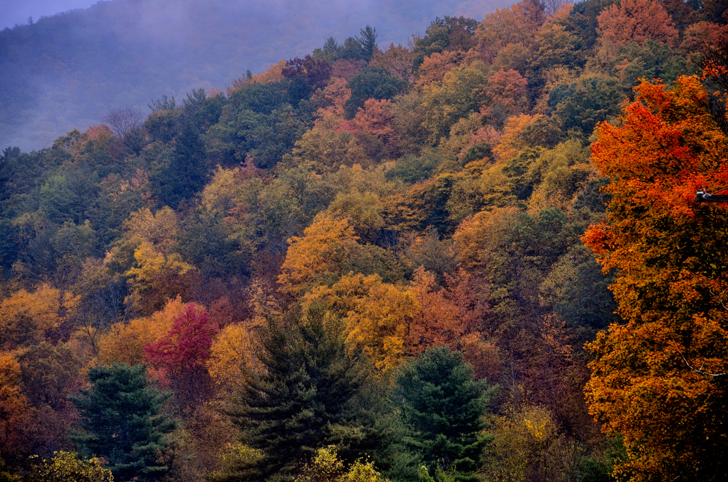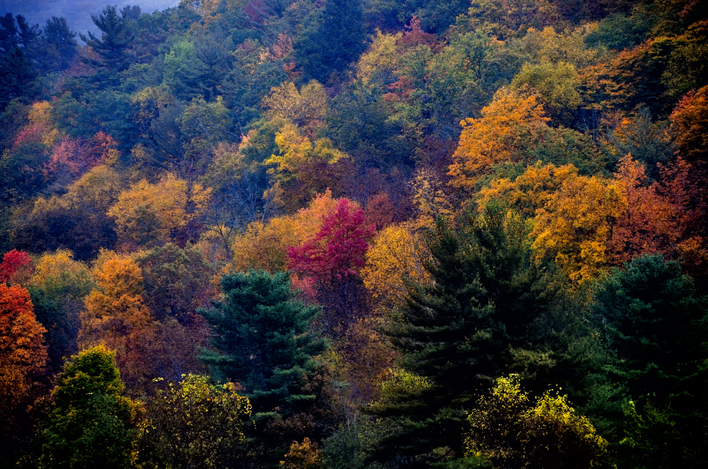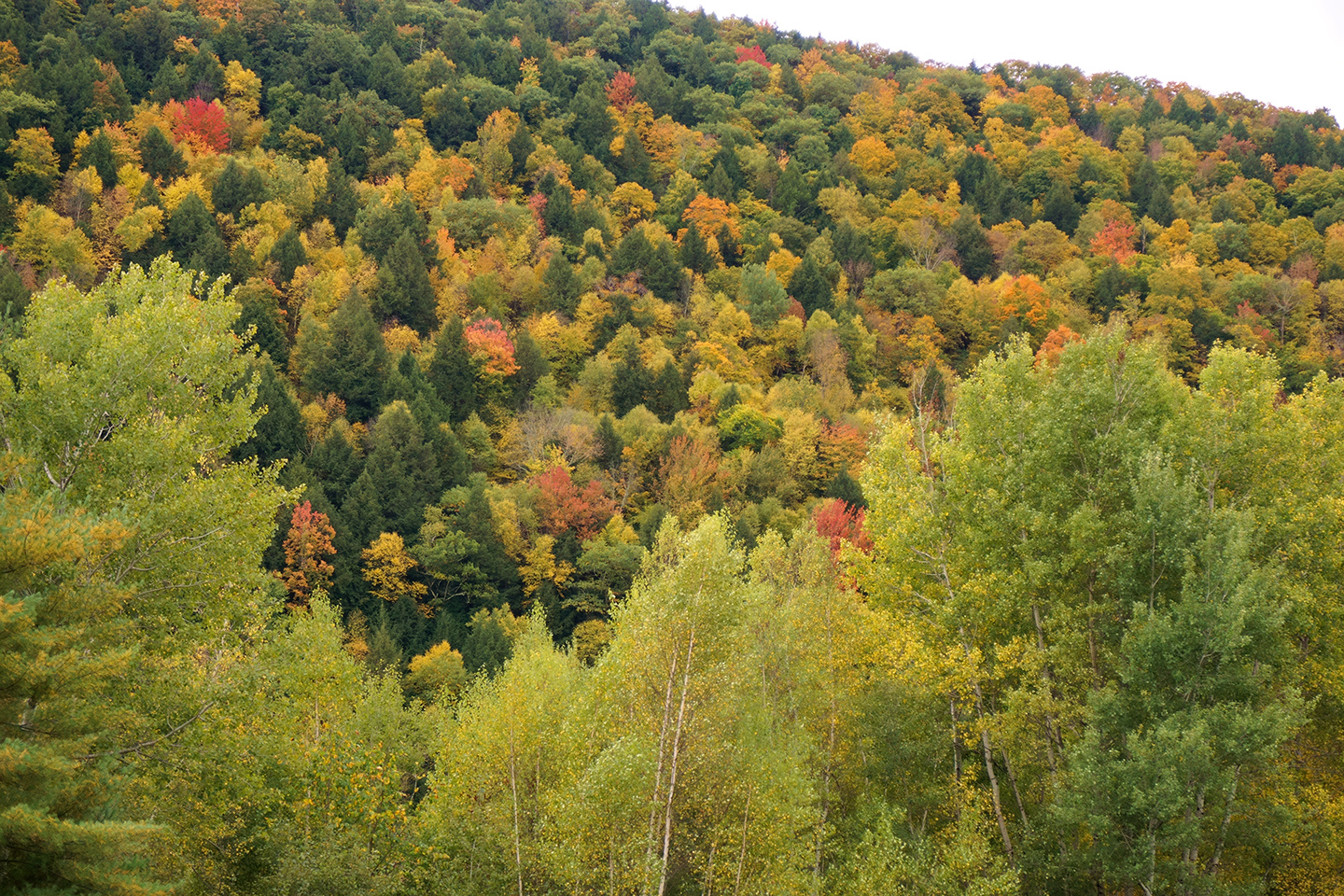The six New England states, taken together, support more than 28 million acres of dense, mature forests. Some of it is evergreen, but most of it is deciduous, so, come the fall, you have more than ten BILLION trees changing color and losing their leaves, all over the course of a couple of weeks.