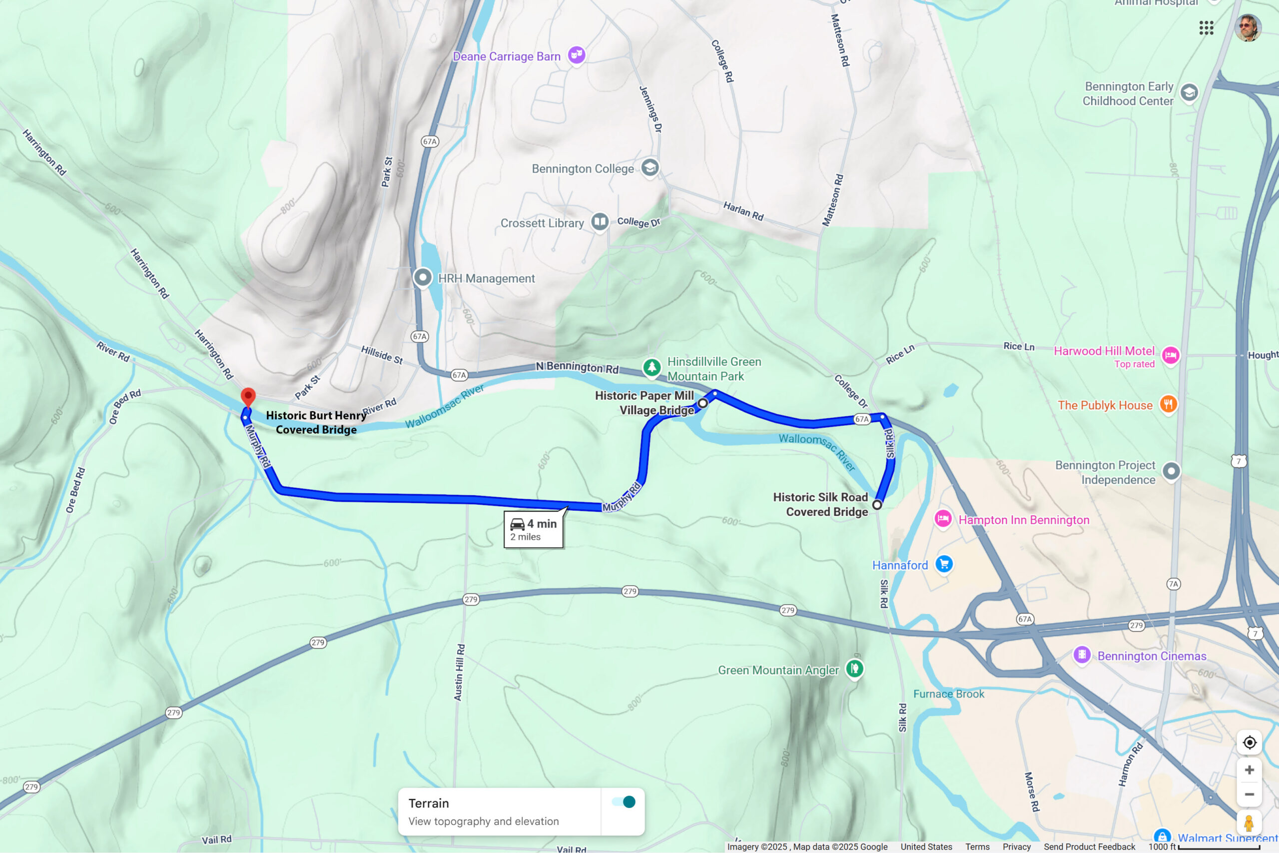 Vermont is famous for picturesque 19th Century covered bridges, and Bennington has three of them, all quite close together, and all crossing the Walloomsac River at various points. The first one we came to was: