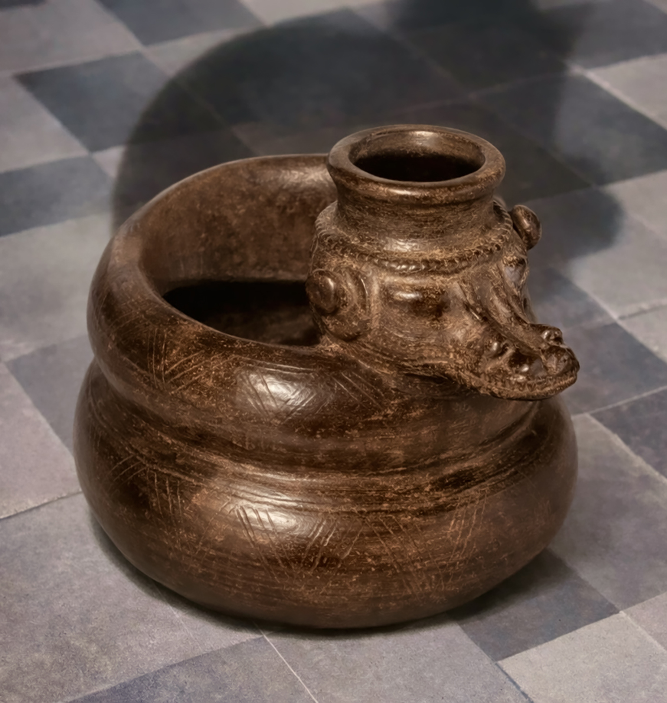 Is it the same piece? It matches my original down to the smallest detail, including the single deep scratch on the top coil. Could that be the very same gouge left by Paul’s machete? <<Toonk!>> That would make this a very small world–but when it comes to Tairona blackware vessels that are shaped like coiled serpents? I should imagine that ours is a very small world, indeed.